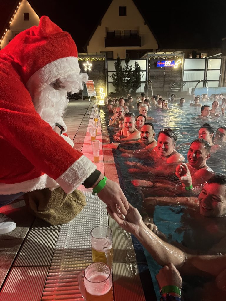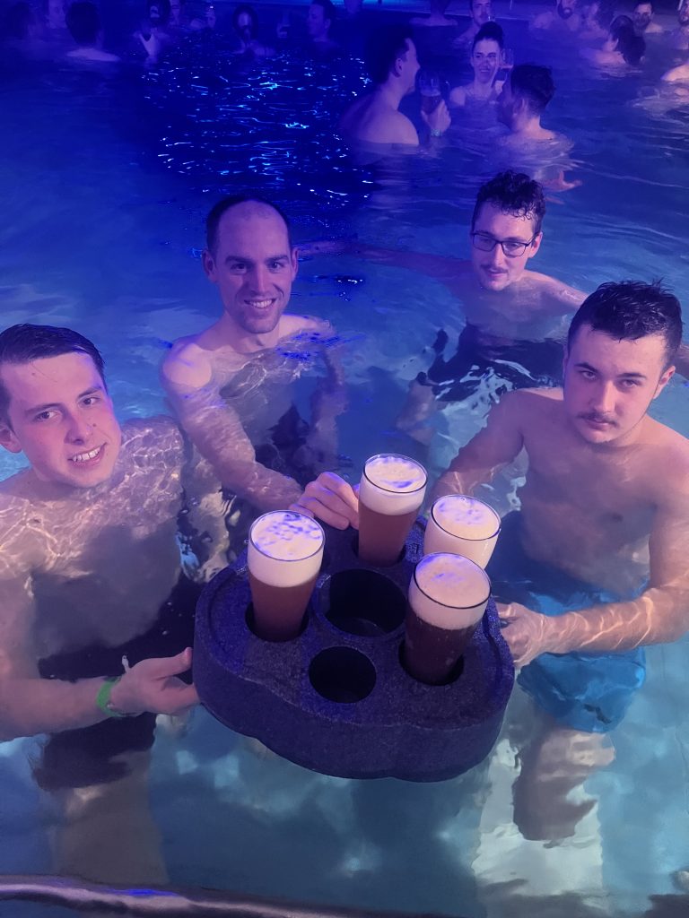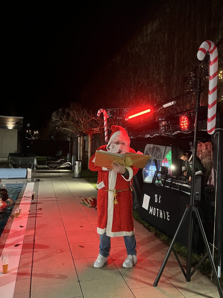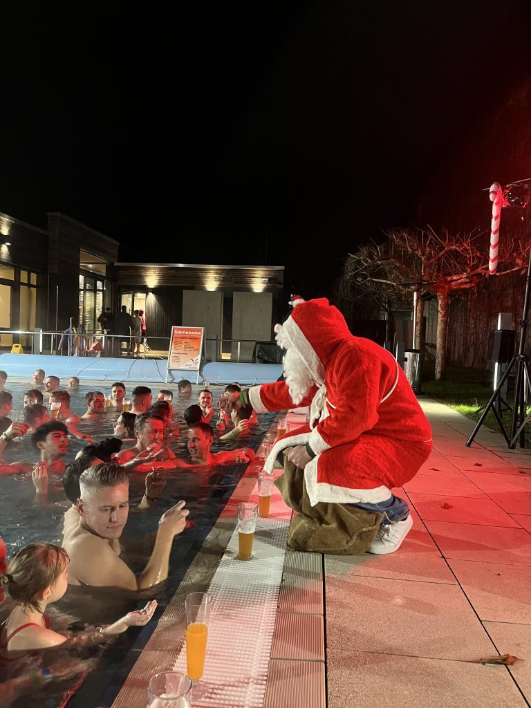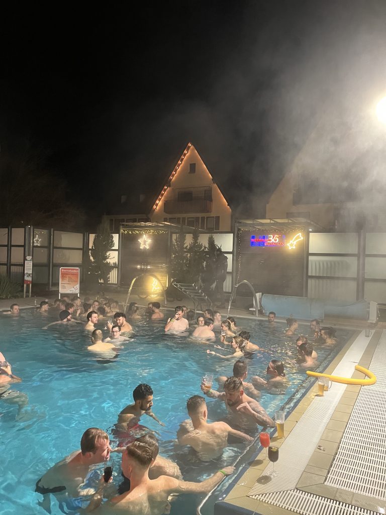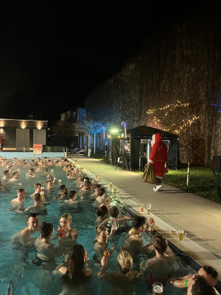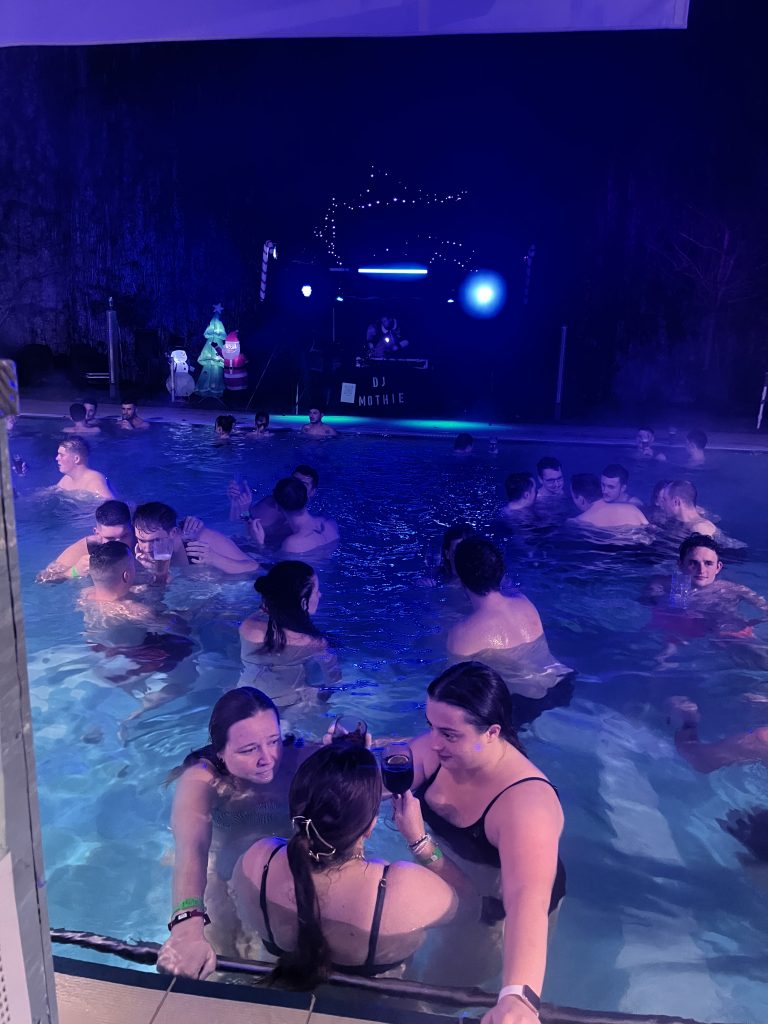 Als Weihnachtselfen haben DJ Mothie und Fördervereinsmitglied Jasmin aufgelegt und den ganzen Abend über für gute Stimmung gesorgt. Die Bar am Beckenrand war durchweg dicht umlagert und der zum Test beschaffte schwimmende Getränkehalter wurde für „gut“ befunden.