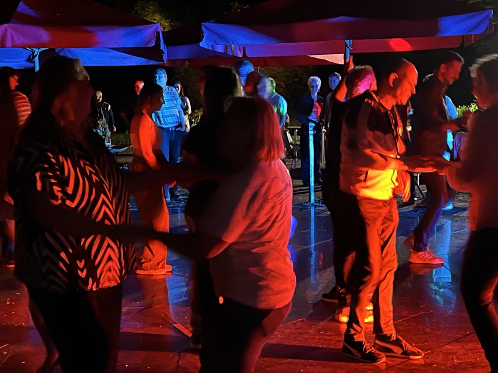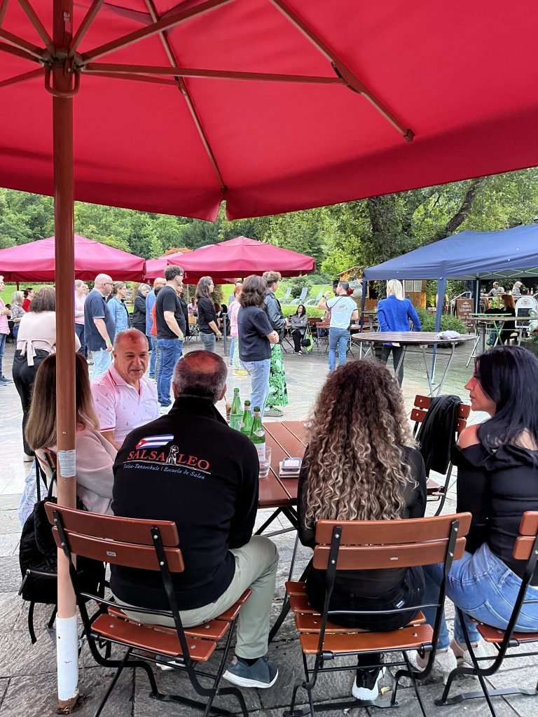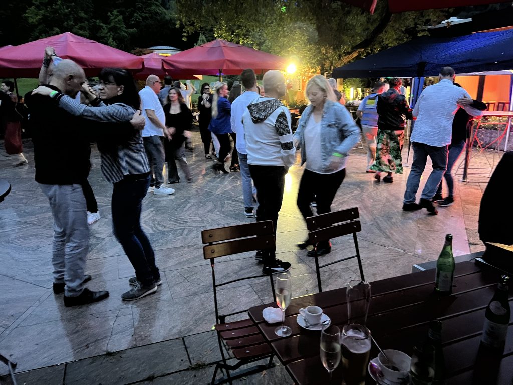 Da Tanzen ja bekanntlich hungrig und durstig macht, gab es Salsiccia vom Grill, Pinsa oder Nachos, sowie Kaffeespezialitäten, Kaltgetränke und natürlich zu Salsa und Kuba passende Cocktails wie Cuba Libre, Mojito oder Virgin Mojito. Trotz der wenig sommerlichen Temperaturen war die Stimmung bestens. Es wurde geplaudert, auf ein Geburtstagskind angestoßen und natürlich eifrig getanzt. Nicht nur zu Salsa-Klängen sondern auch zu anderen karibischen Rhythmen. Zwischendurch gab’s auch eine Freestyle und Schlagerrunde. Der gegen halb elf einsetzende Regen hat der Stimmung keinen Abbruch getan. Unter den Schirmen, dem extra mitgebrachten XXL-Pavillon und natürlich auch unter der Muschel wurde bis kurz nach Mitternacht fleissig weitergetanzt. Von den Besuchern gab es Vorort nur positives Feedback zu Location, sowie der der tollen Tanzfläche und viele äußersten den Wunsch auf eine baldige Wiederholung.
