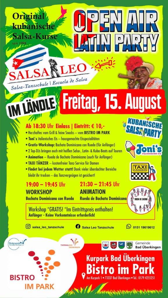 Mitte Juli kam der Kontakt zwischen Antonella vom Bistro im Park und der Tanzschule Salsa Leo zustande. Keine 3 Wochen später fand die die erste Open Air Latin Party in unserem schönen Kurpark statt.