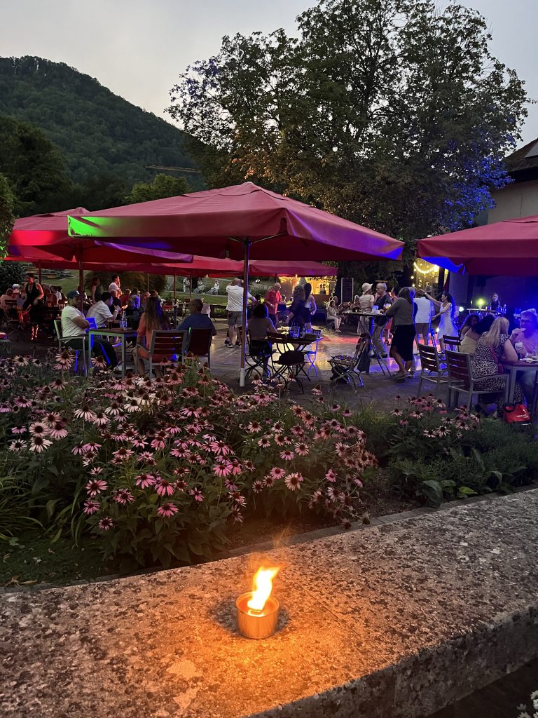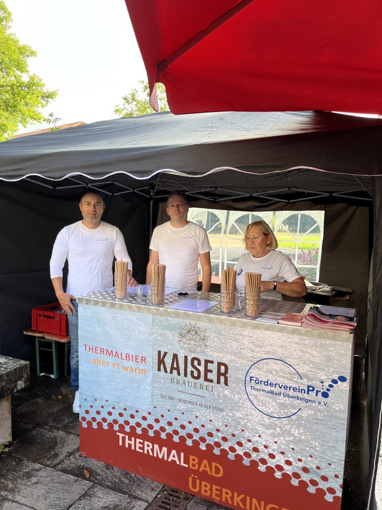 Als es dunkel wurde, sorgten zusätzliche bunte Strahler und die von der Gemeinde zur Verfügung gestellten Wachsfackellichter für eine tolle, einzigartige Atmosphäre. Diese wurde von zahlreichen Besucher, welche nicht nur aus Bad Überkingen und Umgebung sondern z.B. aus Aalen. Heidenheim, Kirchheim kamen, sehr positiv erwähnt. In einzelnen Gesprächen konnten wir auch Werbung für unser Thermalbad machen.