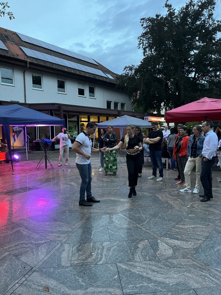 Passender hätte das Wetter am vergangenen Freitag nicht sein können. Ein lauer Sommerabend und passend dazu Latin- & Kuba-Sound in unserem Kurpark. Auch dieses mal kamen die Besucher erst spärlich und die Tanzfläche war erstmals zum Workshop gegen halb acht gut gefüllt. Schritt für Schritt wurden die Basics von Bachata, ein aus der Dominikanischen Republik stammender Tanz geübt. Zuerst getrennt und dann Paarweise. Am Ende der 45 Minuten sah es schon sehr gekonnt aus. Ab diesem Moment war die Tanzfläche stets gut gefüllt.